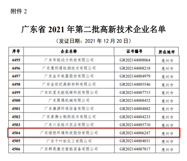 近日,廣東省科學技術廳、財政廳、廣東省稅務局聯(lián)合發(fā)布《2021年第二批高新技術企業(yè)名單》,廣東綠然名列其中。